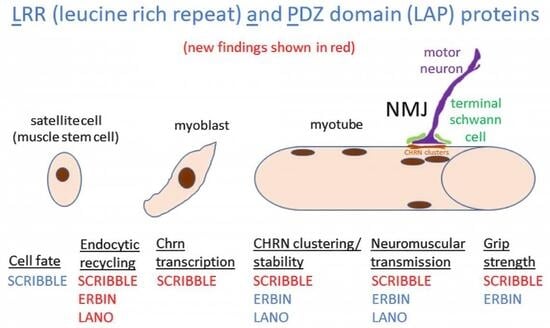 32. Kravic, B.; Huraskin, D.; Frick, A.D.; Jung, J.; Redai, V.; Palmisano, R.; Marchetto, S.; Borg, J.P.; Mei, L.; Hashemolhosseini, S. LAP proteins are localized at the post-synaptic membrane of neuromuscular junctions and appear to modulate synaptic morphology and transmission. J. Neurochem. 2016, 139, 381–395. [Google Scholar] [CrossRef] [PubMed]