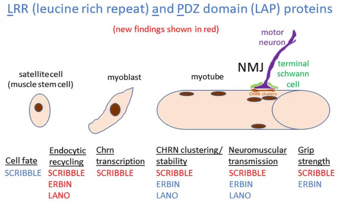 In mature skeletal muscle, Erbin, Lano, and Scribble are all expressed within muscle fibers and further enriched at neuromuscular junctions (NMJs). These proteins are also present in cultured myogenic cells, with Lano and Scribble transcript levels increasing as myoblasts differentiate into myotubes [10,31,32]. Beyond its interaction with ERBB2, ERBIN engages with several additional partners; the segment between its LRR and PDZ domains has been reported to bind postsynaptic density protein 95 [10], EBP50 [33], SMAD3 [34], and MUSK [31]. Notably, neither loss of ERBIN nor substitution of endogenous ERBIN with a mutant form lacking the C-terminal PDZ domain (ERBIN-ΔC) disrupted the localization of LAP proteins at NMJs [32]. Interestingly, ERBINs binding sites for SMAD3 and MUSK partially overlap, and ERBIN, MUSK, or constitutively active variants of ERBB2 and MUSK have all been shown to dampen SMAD3-dependent transcription [31]. Furthermore, siRNA-mediated depletion of ERBIN, LANO, or SCRIBBLE in cultured muscle cells reduced both the density and the formation of CHRN and microclusters. Muscle-specific deletion of Erbin in mice leads to compensatory upregulation of Lano and Scribble, diminished grip strength, increased fatigability, and markedly fragmented NMJs with reduced overall volume [32].