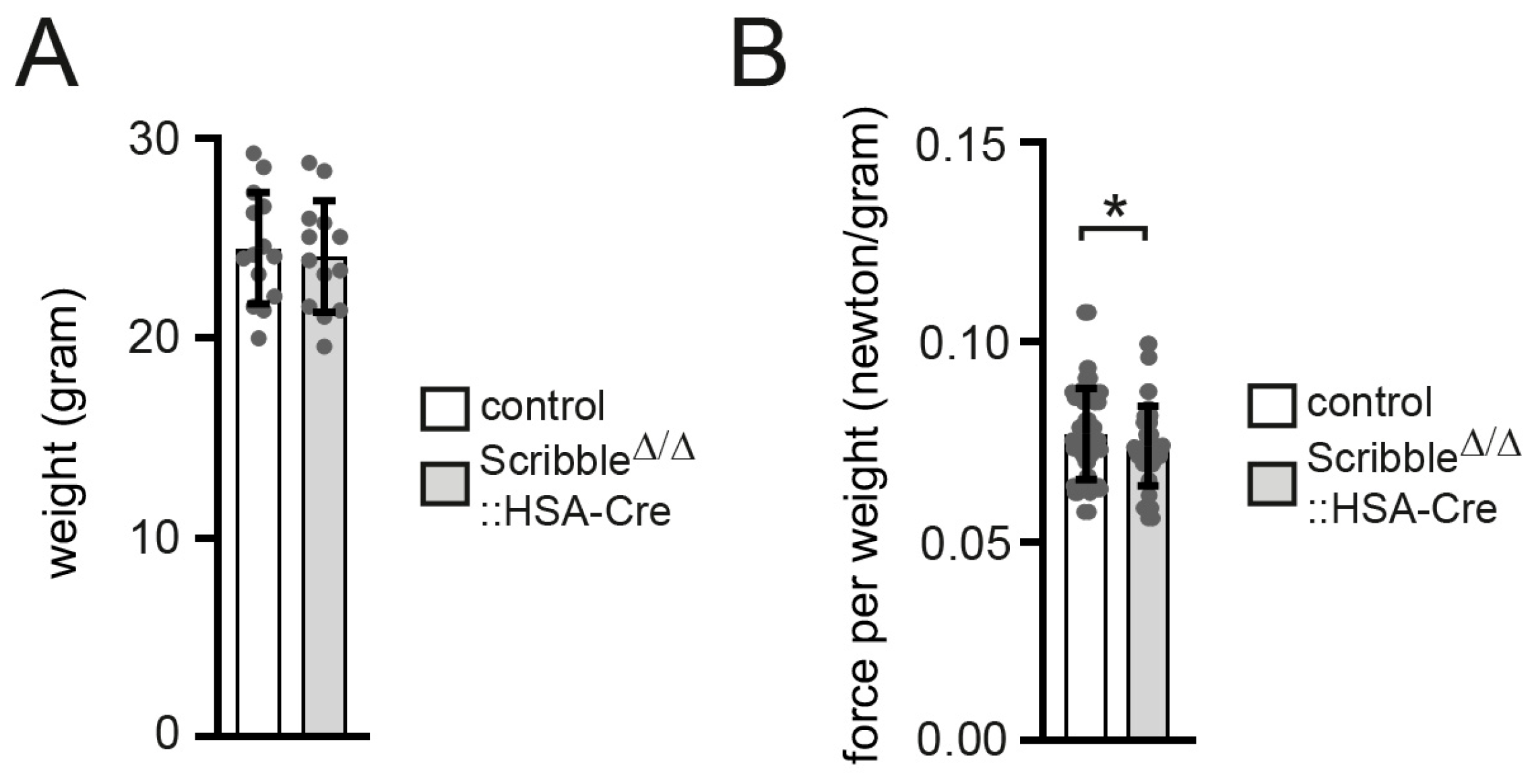 Figure 2. Decreased muscle strength in conditional muscle-specific Scribble-deficient mice. (A) The body weight of control and muscle-specific Scribble-deficient mice is summarized in a graph. Weight measurements were taken once per mouse (minimum 13 mice per genotype, 3–6 months of age). (B) The muscle force of control and muscle-specific Scribble-deficient mice is calculated per body weight of the same mice and presented as newtons per gram in a graph. Grip strength measurements were taken four to six times (minimum 13 mice per genotype, 3–6 months of age). Note, muscle-specific Scribble-deficient mice display mildly, but significantly, less grip strength in comparison with controls. p > 0.05, * p ≤ 0.05.