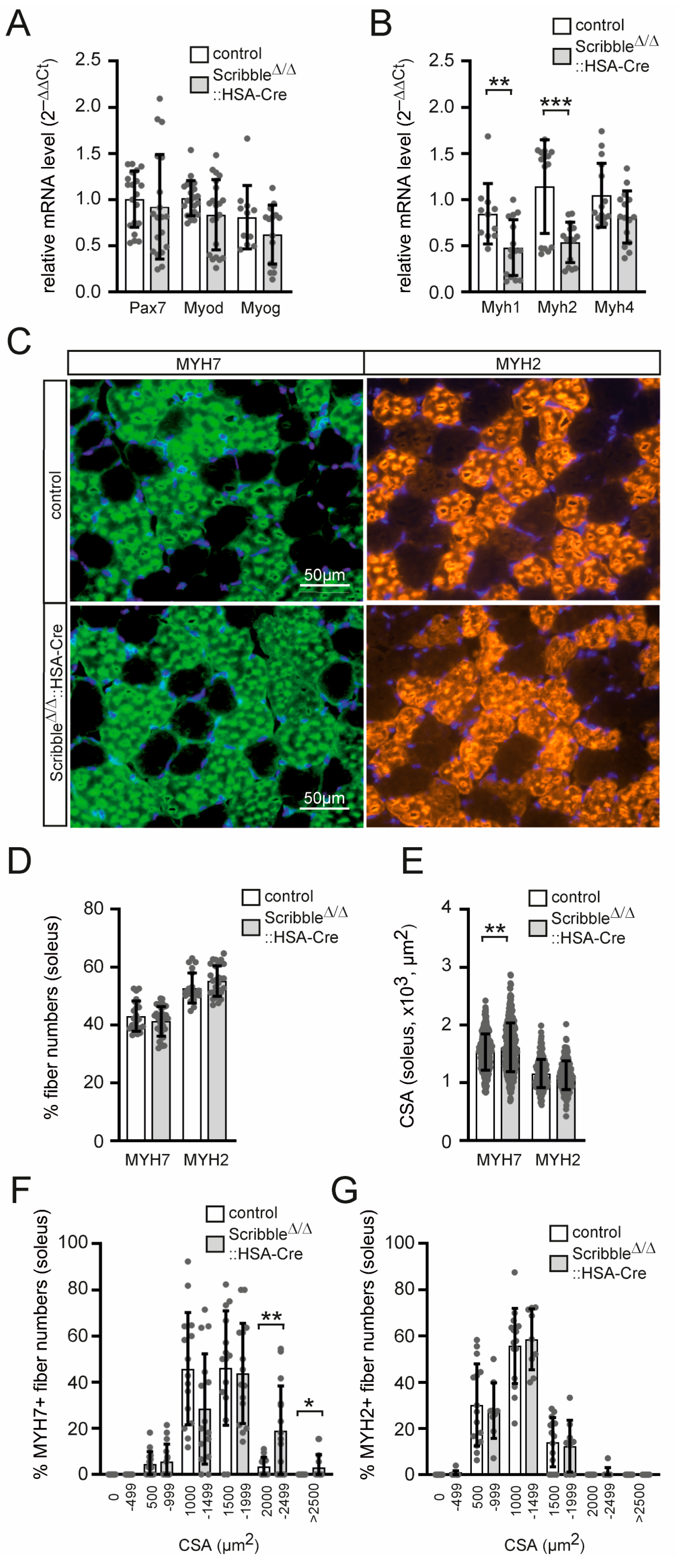 Figure 5. Skeletal muscles lacking SCRIBBLE exhibit a diminished level of transcription of the myosin heavy chain genes 1 and 2. (A) The graph summarizes the comparative analysis of transcript levels of typical myogenic markers, Pax7, Myod, and Myog of control and Scribble-deficient muscles. (B) The transcript level analysis of myosin heavy chain genes in EDL muscle revealed significantly diminished transcript levels for Myh1 and Myh2. One EDL muscle from each mouse (minimum three mice per genotype, ~4 months of age) was analyzed. PCR was performed three to five times in triplicate. (C) Images of typical myosin heavy chain immunostains for slow (type 1, MYH7) and fast (type 2, MYH2) cross-sectioned SOL fibers (minimum three mice per genotype, 4–5 months of age). (D) The graph shows quantification of MYH7 or MYH2 SOL fibers numbers in either the presence or absence of Scribble. (E) Cross-sectional areas (CSA) of fibers (as in D) were analyzed for control or muscle-specific Scribble-deficient mice and are presented in a graph. (F,G) CSA frequency distribution was calculated by plotting % of MYH-positive fibers against CSA size ranges. Note, there are more of the larger fibers within the MYH7-positive fibers. p > 0.05, * p ≤ 0.05, ** p ≤ 0.01, *** p ≤ 0.001.