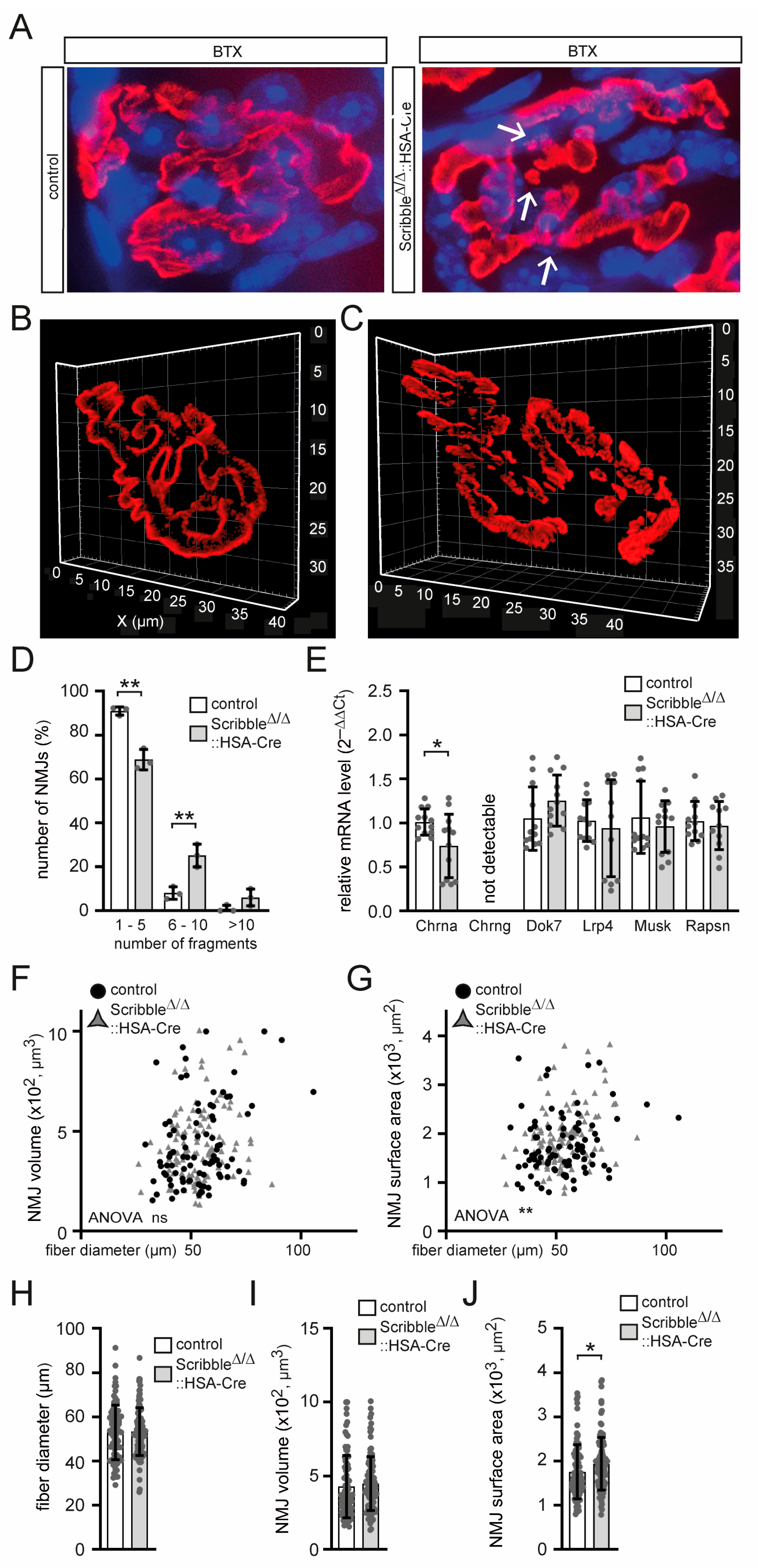 Figure 7. Fluorophore-stained neuromuscular junctions are fragmented in muscles lacking SCRIBBLE. (A) 2D images of typical pretzel-shaped NMJs of adult control or Scribble-deficient SOL muscle fibers are shown (minimum three mice per genotype, ~4 months of age). Note, NMJs of Scribble-deficient mice are of fragmented appearance; the fragmentation sites are marked by arrows. DAPI-stained nuclei appear unchanged. (B,C) Representative 3D images confirm findings depicted by the 2D images (as shown in (A)). (D) Quantification of fragmentation grade for control and Scribble-deficient muscles is plotted for three groups with different numbers of fragments (1–5, 6–10, >10). (E) Late myogenic marker and NMJ transcript levels are analyzed, quantified, and presented in a graph. (F,G) More than 100 NMJs per genotype were imaged, deconvoluted, and quantified regarding NMJ volume (F) or surface area (G), plotted individually versus fiber diameter. Note, in accordance with NMJ fragmentation, surface area of NMJs is increased in Scribble-deficient SOL muscle fibers. (HJ) The graphs present a comparison of NMJs of control and Scribble-deficient SOL muscle fibers regarding fiber diameter, NMJ volume, and surface area. 30–50 individual NMJs (n ≥ 30–50) of SOL muscles of mice were analyzed. ns: not significant; p > 0.05, * p ≤ 0.05, ** p ≤ 0.01.