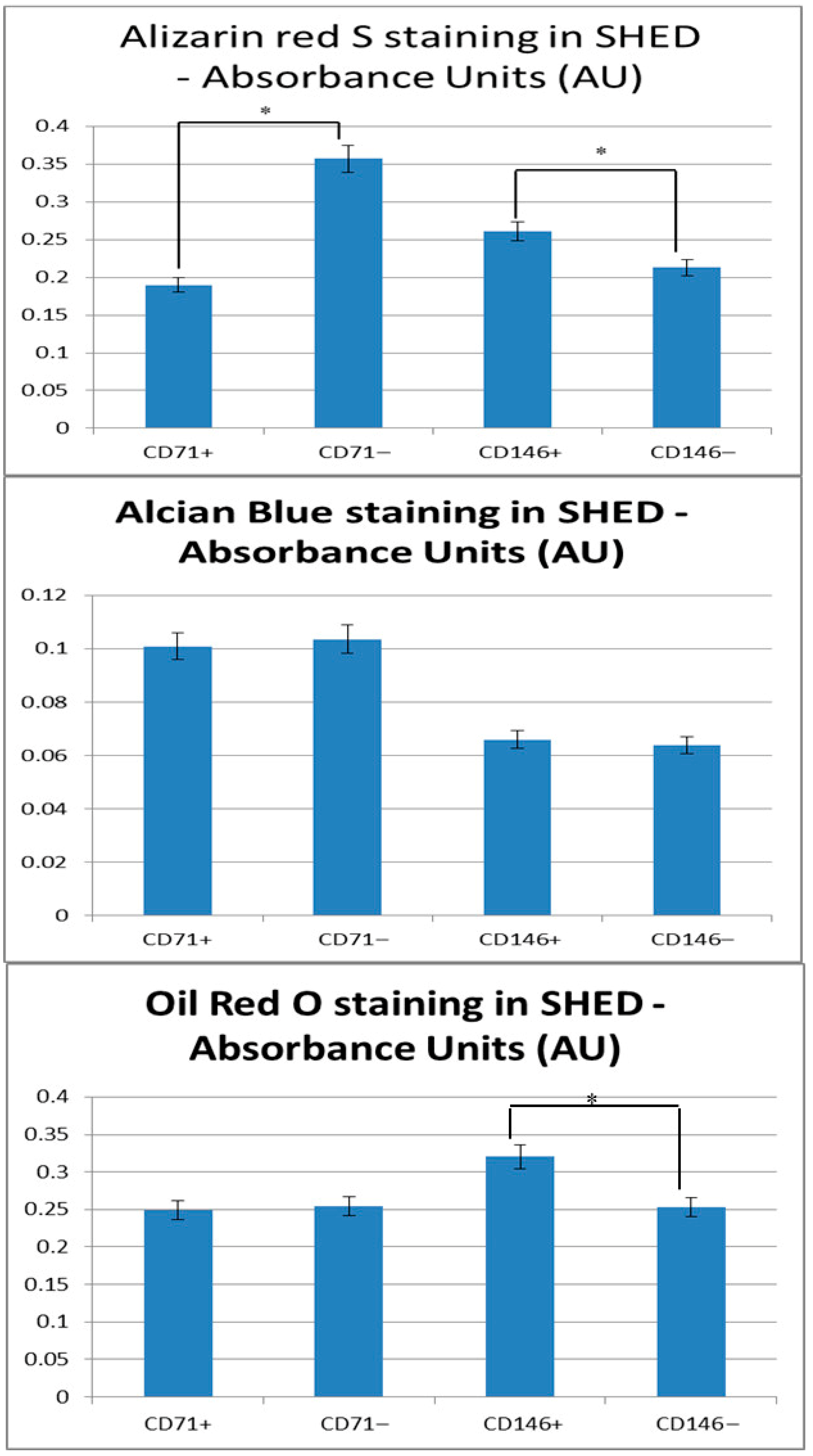 Chondrogenic differentiation: Alcian Blue staining revealed no significant differences between CD71+ and CD71− SHED (0.101 ± 0.001 vs. 0.104 ± 0.002; p = 0.057) or between CD146+ and CD146− cells (0.066 ± 0.002 vs. 0.064 ± 0.001; p = 0.321). It should be noted that this assessment was performed using a 2D monolayer culture, which may not fully support chondrogenesis, and thus these results likely reflect methodological limitations rather than intrinsic differences in SHED subpopulation potential.