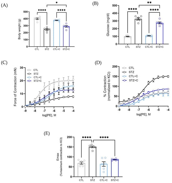 As hyperglycemia drives VSMC dysfunction in diabetes, and curcumin has been shown to attenuate glucose levels [34,35,36,37], it is imperative to investigate treatments that promote vascular protection. Accordingly, we evaluated the effect of curcumin on glucose levels and body weight in STZ-induced diabetic rats. Consistent with previous reports, chronic curcumin treatment improved body weight and reduced elevated blood glucose (Figure 1A,B), supporting its anti-diabetic effects. Notably, despite the improvement in glucose levels, curcumin-treated diabetic rats remained hyperglycemic. These effects are likely attributed to curcumin’s ability to enhance metabolic homeostasis by reducing inflammation and oxidative stress, independent of changes in appetite. Conversely, reports with curcumin show no significant changes in blood glucose, body weight, blood pressure, or appetite [49,50,51].