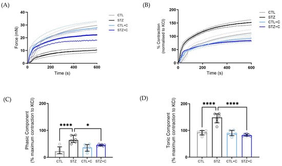 Effects of curcumin treatment on the biphasic contraction in the aorta of diabetic rats. (A) Representative time vs. force curve of the aorta stimulated with a single dose of Phenylephrine (PE, 10 μmol/L). The force (mN) generated was analyzed for a period of T = 600 s. (B) Representative time vs. force curve of the aorta normalized to KCl. (C) Phasic Component. (D) Tonic Component. Groups include control (gray circles), diabetic (black circles), control + curcumin (light blue circles), and diabetic + curcumin (dark blue circles). The dotted lines represent error bars. Data is expressed as median with IQR. Statistical analyses were performed using Mann−Whiney U test; n = 6 per group. p-values indicating significance * p < 0.05, **** p < 0.0001.