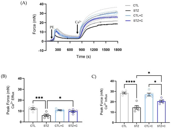 Hyperglycemia disrupts VMSCs homeostasis by promoting low-grade inflammation, oxidative stress, changes in contractile responses, and proteins [7,8,9,10,11], as well as extracellular matrix (ECM) alterations involving elastin degradation and increased collagen deposition [12,13,14]. VSMCs play a crucial role in maintaining vascular tone and reactivity, a physiological mechanism highly dependent on the cytosolic Ca2+ concentration, which regulates VSMC function. Ca2+ mishandling in VSMCs contributes to the progression of diabetic vascular complications [15,16]. Stimulation with α-1 adrenergic receptor agonists such as phenylephrine (PE) elicits a biphasic contraction curve in the aorta comprising a fast phasic component, driven by the release of Ca2+ from the sarcoplasmic reticulum (SR) followed by a slow tonic component mediated by the Ca2+ influx from the voltage-dependent and -independent channels [17]. In diabetes, this biphasic contraction curve is compromised, indicating Ca2+ mishandling in VSMCs [18], leading to impaired contractile responses and changes in the vessel wall, characteristics of diabetic vasculopathies.