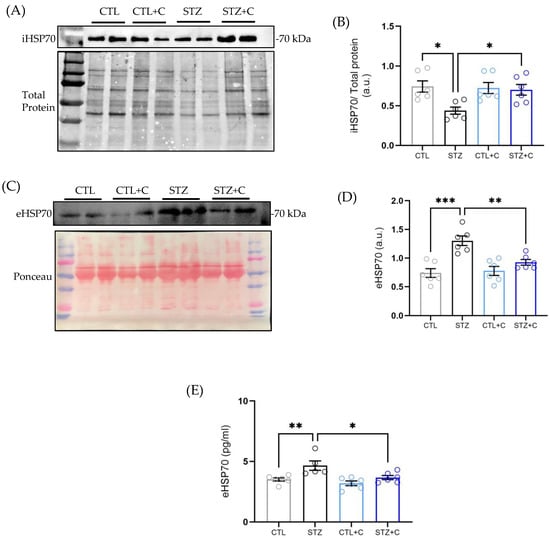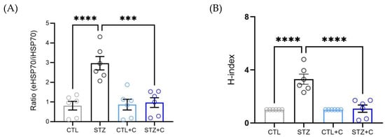 The ratio eHSP70/iHSP70 was calculated by dividing the densitometric value of eHSP70 by that of iHSP70. The H-index, an indirect marker of low-grade inflammation, was calculated by dividing the eHSP70/iHSP70 ratio of diabetic animals by the ratio of controls, which was set to 1 as previously described [18,45].