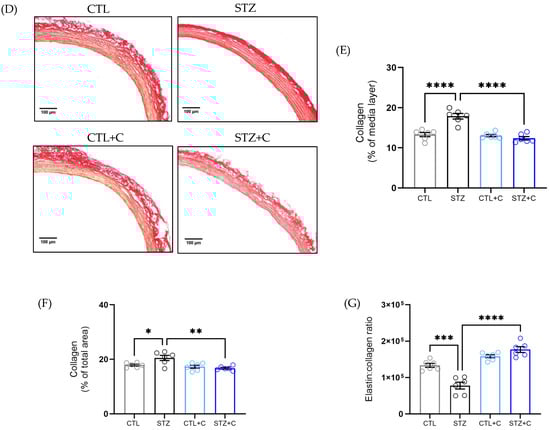 ECM alterations in diabetes are characterized by increased collagen and reduced elastin [12,13,14], which are not uniform across different vascular beds and are also sex -dependent [70]. For example, in the T2D model, aortic elastin-to-collagen mRNA ratio is reduced, with an opposite trend observed in the coronary artery [71], highlighting the need for potential therapeutics that preserve aortic wall structure. In addition, the composition of aortic ECM is influenced by multiple mechanisms, including increased collagen synthesis via transforming growth factor type-β1 (TGF-β1) mediated by HSP70-TLR4 signaling, and dysregulated Ca2+ dynamics via Matrix Metalloproteinases (MMPs), which are upregulated in diabetes [29,30]. Diabetes-related Ca2+ fluctuations may affect MMP activity and promote ECM degradation, suggesting that Ca2+ dysregulation and HSP70 may be involved in ECM alterations. In our study, diabetic aorta exhibited reduced elastin autofluorescence, increased fragmentation, and collagen accumulation in both the medial layer and the total vessel, resulting in a reduced elastin-to-collagen ratio that is reflective of stiffer vessels (Figure 6A–G). Notably, curcumin treatment prevented all these alterations (Figure 6A–G). A similar pattern has been reported in aged mice, where curcumin normalizes aortic collagen, but without significant changes in elastin [72].