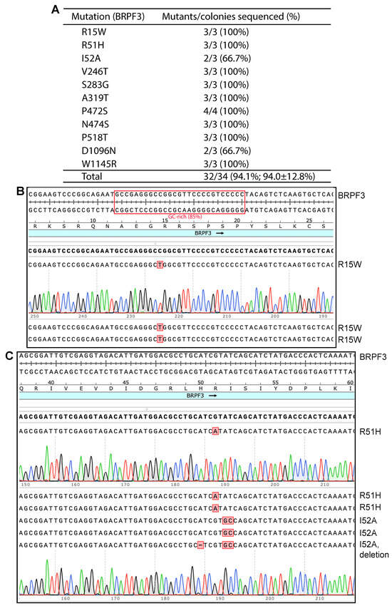 In addition to SuperFi II polymerase, Q5 DNA polymerase can be used for P3a mutagenesis [10]. Thus, we also investigated how efficient this enzyme is for generating BRPF3 mutants. In this case, we tested 4 BRPF3 mutants: R15W, R51H, I52A and K1075E. E1075K is an unexpected substitution present on the expression vector that we used, so K1075E was designed to repair the E1075K substitution. As shown in Figures S4C,D and S5, we sequenced 2–3 plasmids per mutation. Among the 12 plasmids that were sequenced, 10 carried the correct mutations. Among the remaining two, one was wild-type and the other carried an unexpected one-nucleotide deletion. Thus, the mutagenesis efficiency was 10/12 (83.3%, Figure S4B). This is within the range observed with the other 10 expression plasmids when P3a mutagenesis was used [10]. These results indicate that Q5 DNA polymerase can efficiently produce mutants from the BRPF3 expression plasmid. However, the efficiency may be slightly lower than SuperFi II polymerase (Figure 1). This minor difference aligns with the previous observations [10].