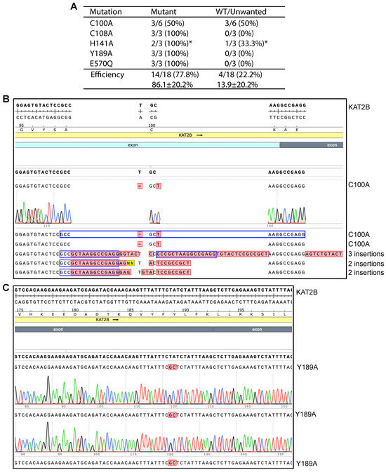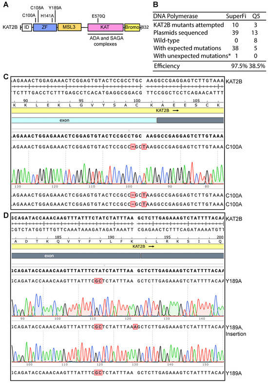 Figure 2. High efficiency of P3b site-specific mutagenesis to engineer KAT2B mutants. (A) Domain organization of KAT2B. Remaining poorly characterized, the N-terminal half of KAT2B is composed of one zinc finger and an MSL3-like domain. The coding sequence for the peptide from the N-terminus up to the zinc finger is extremely GC-rich, reaching 95–100% in certain areas (Figures S1C and S2A). This region encodes an Ala-, Gly- and Pro-rich intrinsic disorder (ID) domain, which has no known functions but may be involved in phase separation as reported for many other such domains [35]. The C-terminal half of KAT2B comprises two well-characterized domains: the acetyltransferase domain required for formation of several multiprotein complexes (including ADA and SAGA complexes) and the bromodomain important for recognition of acetylated chromatin [36]. Five point mutants are illustrated, with four located within the zinc finger region (C100A, C108A, H141A and Y189A) and one in the lysine acetyltransferase (KAT) domain (E570Q). The E570Q mutant is expected to inactivate the enzyme as E570 is a catalytic residue [37]. (B) Efficiency of P3b mutagenesis. Prior to PCR, the KAT2B expression plasmid was heat-denatured at 105 °C for 5 min and rapidly cooled on ice before PCR amplification with SuperFi II or Q5 DNA polymerase. We analyzed 3–4 plasmids per mutation. For the SuperFi II polymerase condition, we analyzed 39 plasmids from engineering 10 point mutants and all but one carried the correct mutations, resulting in the efficiency of 97.5%. For the Q5 polymerase condition, we analyzed 13 plasmids for engineering three point mutants and only five were the correct mutants. The remaining eight plasmids were wild-type, leading to an efficiency of 38.5%. * unwanted mutations from erroneous primer synthesis and/or nucleotide misincorporation during PCR. (C) Sequence chromatograms of three plasmids sequenced for engineering the C100A mutant of KAT2B with SuperFi II polymerase. These plasmids were from the SuperFi II polymerase condition. All three were correct, leading to an efficiency of 100%. (D) Sequence chromatograms of three plasmids sequenced from engineering the Y189A variant of KAT2B with SuperFi II polymerase. Two carried the correct mutation and the third one harbored an A insertion at the primer site, likely due to primer impurities, at an efficiency of 66.7%.