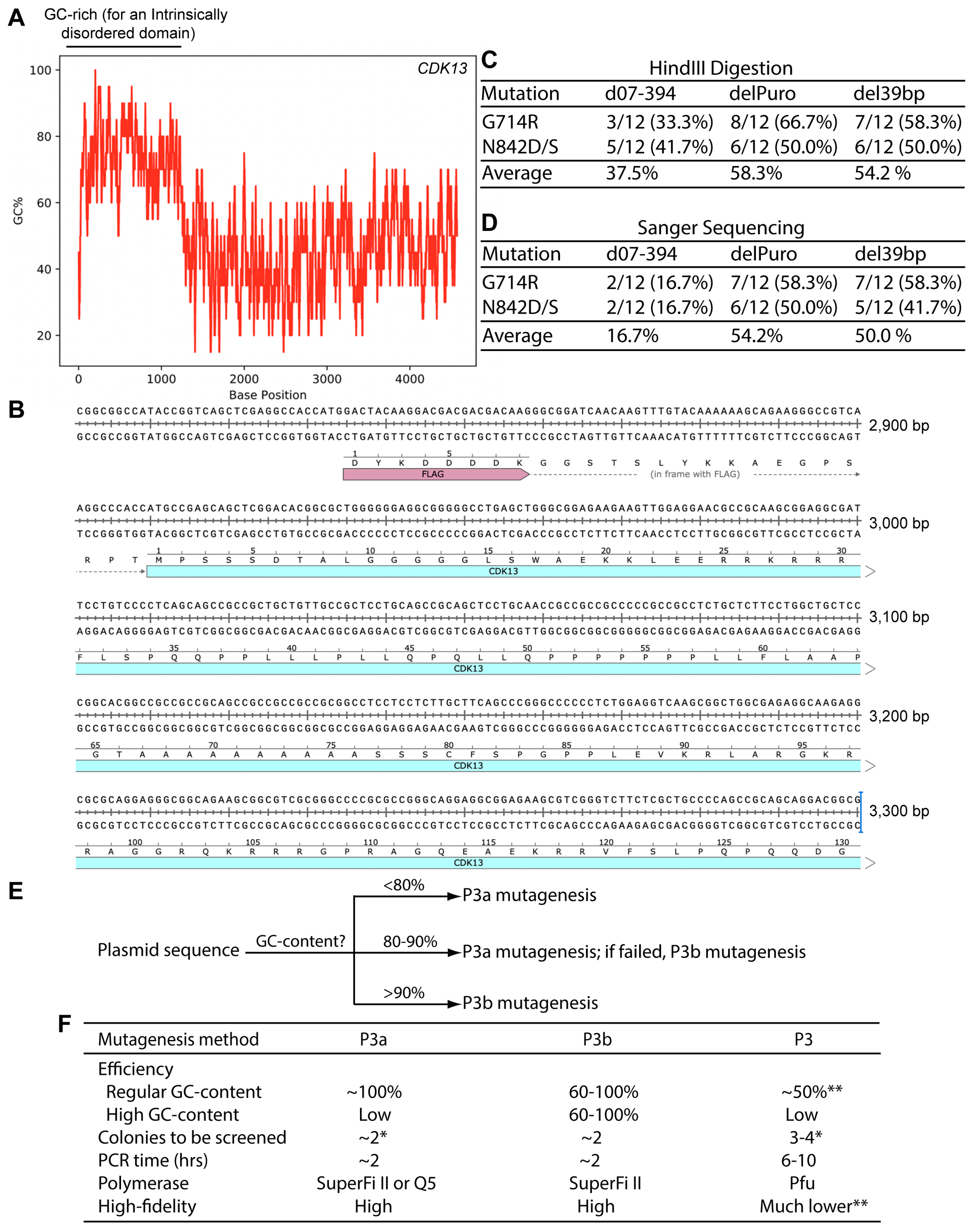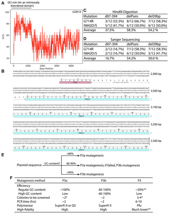 Figure 7. The coding sequence for human CDK13 harbors an extremely GC-rich region. (A) Distribution of the GC-content along the coding sequence of human CDK13 expression. The human CDK13 coding sequence was copied and pasted into the calculation box provided by the VectorBuilder website. The GC-content was calculated with a window size of 20. (B) Sequence of the extremely GC-rich region of the human CDK13 coding sequence. Only a portion of the region is shown here. (C) For each mutagenesis reaction, plasmids from 12 bacterial colonies were digested with HindIII digestion, with counts of plasmids with the expected digestion patterns shown here. The remaining plasmids showed deletions. (D) Plasmids with the expected digestion patterns, as shown in panel D, were sequenced and counts of those with the expected mutations are shown here. The remaining ones were wild-type. The total counts of plasmids refer to those initially analyzed by restriction digestion. (E) An operational model on selecting P3a or P3b mutagenesis for a given plasmid. The percentage values refer to local regions rather than the entire plasmids, are based on our limited experience with ~20 expression plasmids and should only be used as an approximate guide. For P3a mutagenesis, either Q5 or SuperFi II polymerase can used [10], but for P3b mutagenesis, SuperFi II polymerase is preferred (Figure 2B and Figure 6B). In terms of costs, Q5 polymerase is less expensive than SuperFi II polymerase. However, the costs for generating mutants are mainly from primer synthesis and plasmid sequencing, instead of the polymerases used for mutagenesis reactions. For P3b mutagenesis, the requirement for the extra denaturation step is dependent on mutations to be engineered. For some of those near or within a GC-rich region, such as C100A of KAT2B (Figure 3A) and Ala162fs of CDK13 (Figure 6B), this step is required for high efficiency. (F) Summary of different parameters for comparison of the P3, P3a and P3b mutagenesis methods. The P3a and P3b methods are much more efficient and faster than P3 mutagenesis [8,10]. Moreover, the risk of introducing unwanted mutation is also much lower with the P3a and P3b methods. The single asterisk (*) denotes the colony number for analysis when plasmids with regular GC-rich content are used for mutagenesis. The double asterisks (**) refers to the notion that P3a but not P3 mutagenesis worked efficiently for engineering the R15W mutant of BRPF3 (Figure 1) [8]. Moreover, P3 mutagenesis frequently introduced unwanted insertions and deletions at the primer sites (Figure S3). As for plasmids with extremely GC-rich sequences, it is almost impossible for P3/P3a mutagenesis or many colonies needs to be analyzed, as shown herein for KAT2B.