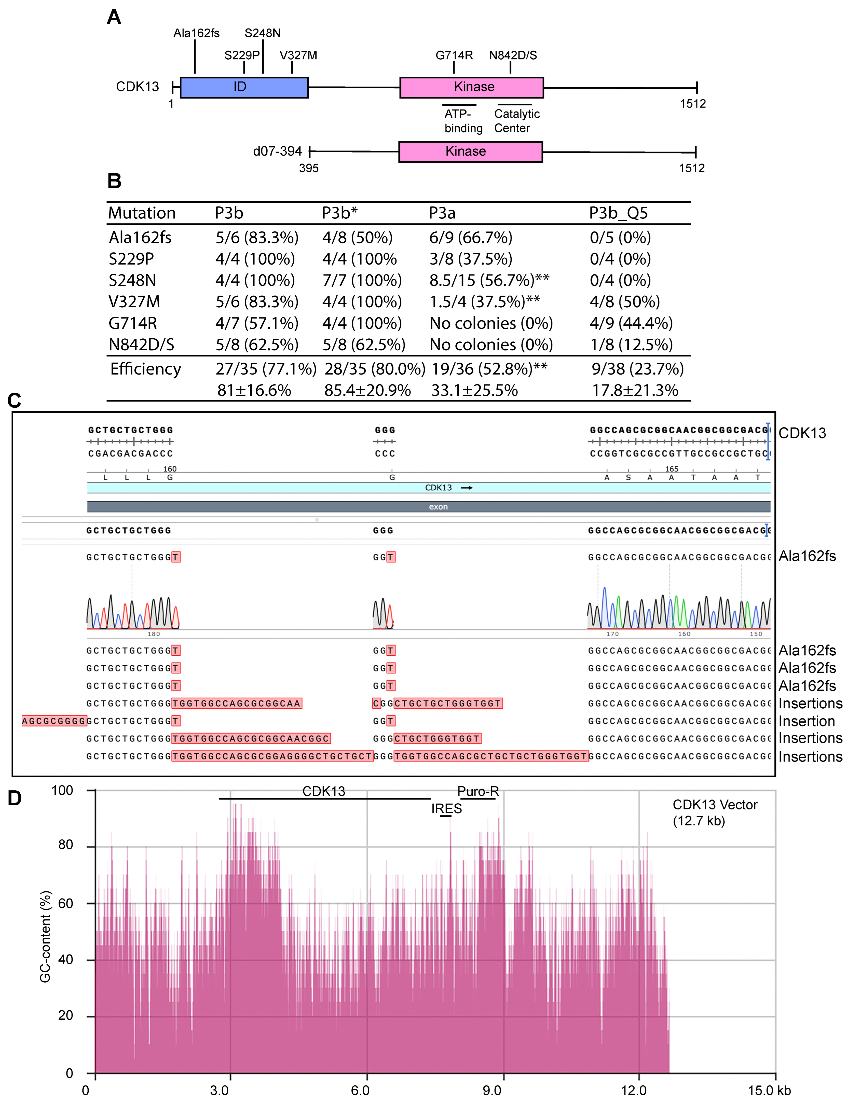 Figure 6. P3a and P3b mutagenesis for engineering various CDK13 mutants. (A) Domain organization of CDK13, shown with seven point mutants identified in patients with cancer or a developmental disorder [13,14,48]. d07-394, a deletion mutant with the ID domain removed, is also shown. ID, intrinsically disordered domain. (B) Efficiency of P3a and P3b mutagenesis in generating seven different CDK13 mutants. For P3b or P3b* mutagenesis, 4–8 colonies were sequenced per reaction and the number of mutant colonies are listed here, along with mutagenesis efficiency (%) in brackets. P3b* refers to P3b mutagenesis without the extra denaturation step prior to PCR amplification. P3a and P3b_Q5 mutagenesis reactions yielded no or few colonies, so mutagenesis reactions needed to be repeated to obtain sufficient colonies for analysis. For P3a mutagenesis, 4–15 colonies were sequenced per mutation if available, from four different reactions. Notably, from P3a mutagenesis, no colonies were obtained from four different mutagenesis reactions to engineer the G714R and N842D/S mutants. P3b_Q5 denotes P3b mutagenesis with Q5 DNA polymerase used for PCR. For P3b_Q5 mutagenesis, 4–9 colonies were analyzed per mutation, from two different reactions. A mixed clone between the wild-type and mutant is counted as 0.5 as denoted by the double asterisk (**). (C) Representative sequence results of eight plasmids from P3b mutagenesis without the extra denaturation step prior to PCR amplification. (D) Distribution of the GC-content along the entire CDK13 expression vector. The sequence from the Addgene website for this plasmid was copied and pasted into the calculation box provided by the NovoPro website. The GC-content was calculated with a window size of 20. The vector is 12.7 kb and the CDK coding sequence corresponds to nucleotides from 2910 to 7448. A GC-content display tool within the SnapGene package was also used to assess the GC-rich regions. IRES, internal ribosome entry site; Puro-R, puromycin-resistant marker.