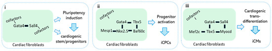 Our group has worked on Sall4 due to its direct interactions with the iCM reprogramming factors Tbx5 and Gata4. We initially substituted Gata4, Mef2c, or Tbx5 individually with Sall4 in both mice and rat cardiac fibroblasts. While overexpression of GMT upregulated the mRNA levels of stemness factors such as Sall4, Bmi1, and p63, the combination of Gata4/Mef2C/Sall4 triggered a remarkable increase in Oct4 and Nanog mRNA expression over seven days. Prolonged culture led to the formation of stem-like clusters that were partially positive for alkaline phosphatases staining [41]. In extended studies, the combination of Sall4 and Gata4, which physically interact, stimulated cardiac fibroblast transitions into partially stem/progenitor-like cells with enhanced ex vivo expandability and clonogenic potential [42]. Moreover, these reprogrammed cells demonstrated strong cardiogenic potential, differentiating into contractile cardiomyocytes, endothelial cells, and even neuron-like cells. Notably, this cardiogenic reprogramming process also showed efficacy in human cardiac fibroblasts, highlighting its potential for clinical applications (Table 1) [42,43].