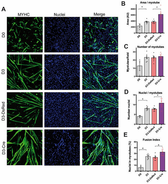 The reduction in RyR1 protein amount in primary myotubes is associated with an increase in myotube differentiation. (A) Representative immunofluorescence images of cultures in proliferation (D0) and after 3 days of differentiation, non-transduced (D3) or transducted with AdV-DsRed (D3-DsRed) or AdV-Cre (D3-Cre). The myotubes were stained with myosin heavy chain (MYHC, green) and the nuclei with Hoechst (blue). Scale bar: 100 um. (B) Quantification of the area of myotube, defined as the total surface occupied by myotubes divided by the number of myotubes per field, in at least 20 fields for each condition. Statistical analysis: Mann–Whitney t-test. D3 vs. D0 p = 0.0167; D3-Cre vs. D3-DsRed p = 0.0006. *, p < 0.05. (C) Quantification of the number of myotubes per field. Statistical analysis: Mann–Whitney t-test, non-significant. (D) Quantification of the number of nuclei per myotube, from at least five different cultures. Statistical analysis: Mann–Whitney t-test. D3 vs. D0 p = 0.0167, D3-Cre vs. D3-DsRed p = 0.0379. *, p < 0.05. (E) Quantification of fusion index, representing the percentage of nuclei inside MYHC-positive cells with three or more nuclei/total nuclei. Statistical analysis: Mann–Whitney t-test. D3 vs. D0 p = 0.0167, D3-Cre vs. D3-DsRed p = 0.0041. *, p < 0.05.
