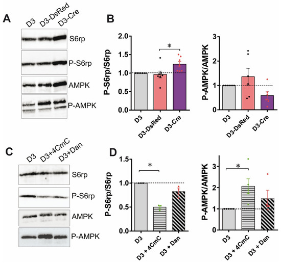 Both RyR1 quantity and calcium channel activity modulate the AMPK/mTOR pathway. (A) Representative Western blot of total and phosphorylated forms of S6rp and AMPK proteins on control (D3), AdV-DsRed transduced (D3-DsRed) and AdV-Cre transduced (D3-Cre, i.e., RyR1-Rec) RyR-Flox primary cell cultures at 3 days of differentiation. (B) Quantification of the relative amount of phosphorylated S6rp compared to the total S6rp amount performed in five to six independent cultures (left graph), and the relative amount of phosphorylated AMPK compared to the total AMPK amount performed in five to six independent cultures (non-transduced CTRL D3, gray bars; D3-DsRed, red bars; D3-Cre, purple bars). The amount in non-transduced cells is set to 1 for normalization. Statistical analysis: Mann–Whitney. D3-Cre vs. D3-DsRed p = 0.0111 for P-S6rp/S6rp. *, p < 0.05. (C) Representative Western blot of total and phosphorylated forms of S6rp and AMPK proteins on differentiated myotubes either non-treated (D3), treated for 3 h at 3 days of differentiation with 4-CmC (D3 + 4CmC), or treated for 3 h with Dantrolene (D3 + Dan). (D) Quantification of the relative amount of phosphorylated S6rp compared to the total S6rp amount performed in four independent cultures (left graph), and the relative amount of phosphorylated AMPK compared to the total AMPK amount performed in independent cultures (non-treated D3 myotubes, gray bars; myotubes treated with 4CmC horizontal stripes, myotubes treated with Dantrolene inclined stripes). The amount in non-treated cells is set to 1 for normalization. Statistical analysis: Mann–Whitney. D3 + 4CmC vs. D3 p = 0.0043 for P-S6rp/S6rp; D3 + 4CmC vs. D3 p = 0.0407 for P-AMPK/AMPK. *, p < 0.05.