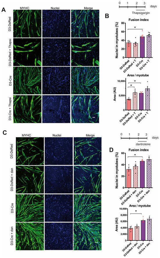RyR1 effect on myotube differentiation is independent of RyR1-mediated calcium release. (A) Representative immunofluorescence images of primary myotube culture at 3 days of differentiation from control (D3-DsRed) or RyR1-Rec (D3-Cre) cultures and treated or untreated with thapsigargin (Thapsi or T, 50 nM) for the last 24 h of differentiation. The myotubes were visualized with myosin heavy chain staining (MYHC, green) and the nuclei with Hoechst (blue). Scale bar: 100 μm. (B) The fusion index and area of myotubes in control myotubes (D3-DsRed) or RyR1-Rec myotubes (D3-Cre), treated or untreated with thapsigargin (24 h, 50 nM), from five to six independent cultures. Statistical analysis: Mann–Whitney t-test. Fusion index: D3-Cre vs. D3-DsRed p = 0.0260. Area of myotubes: D3-DsRed + Thapsi vs. D3-DsRed p = 0.0079; D3-Cre vs. D3-DsRed p = 0.0079. *, p < 0.05. (C) Representative immunofluorescence images of primary myotubes culture at 3 days of differentiation from control (D3-DsRed) or RyR1-Rec (D3-Cre) cultures, treated or untreated with dantrolene (20 µM) for the last 24 h of differentiation. The myotubes were visualized with myosin heavy chain staining (MYHC, green) and the nuclei with Hoechst (blue). Scale bar: 100 μm. (D) The fusion index and area of myotubes in control myotubes (D3-DsRed) or RyR1-Rec myotubes (D3-Cre), treated or untreated with dantrolene (48 h, 20 µM), from four independent cultures. Statistical analysis: Mann–Whitney t-test. Fusion index: D3-Cre vs. D3-DsRed p = 0.0286. Area of myotubes: D3-Cre vs. D3-DsRed p = 0.0286. *, p < 0.05.