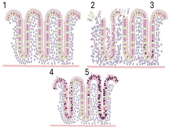 The sequence of CAC tumorigenesis—pink and yellow cells represent enterocytes and goblet cells, respectively; 1.—Normal mucosa; 2.—Active inflammation, with neutrophil infiltrate and inflammatory expansion of lamina propria; 3.—Low-grade dysplasia, and hyperchromasia (represented by dark nuclei), with prominent nucleoli confined to the crypts’ bottom 4.—High-grade dysplasia, abundant aberrant nuclei, hyperchromasia, and abnormal mitotic figures; 5.—In situ carcinoma with multiple aberrant mitotic figures, and extended hyperchromasia with aberrant nuclei.