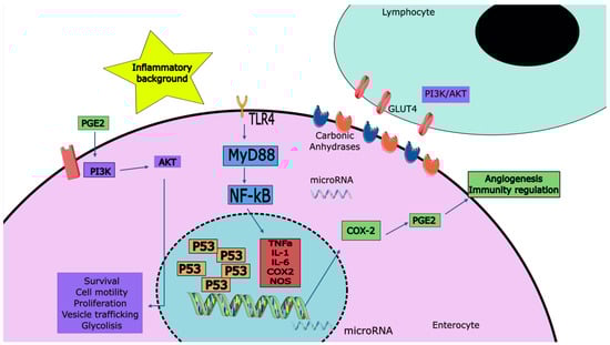 A summary of the molecular mechanisms of CAC. Tp53 mutations cause an overexpression and loss of function. TLR4 alterations, through MyD88-dependent signaling, induce and intensify the proinflammatory environment. COX-2 induces PGE2 expression, which in turn causes angiogenesis and immunity regulation through PI3K signaling. PI3K/AKT is known to promote many cytokines and promote GLUT4 migration to enhance metabolism in TH2 and TH17 lymphocytes. Carbonic anhydrases regulate the acidic environment, associated with high metabolic demands. MiRNA are present in both nuclear and extranuclear spaces, with diverse functions as gene expression regulators.