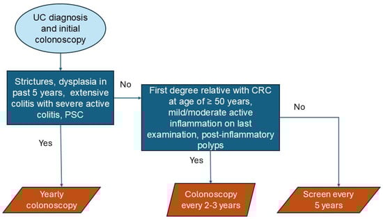 Surveillance colonoscopies are usually started after 8–10 years of diagnosis or symptom onset of UC in accordance with the latest ACG and ECCO guidelines, respectively; surveillance schedules should be individualized, taking into account risk factors for developing colorectal cancer—high-risk features include strictures, dysplasia detected in past 5 years, extensive colitis with severe active inflammation, and concomitant diagnosis of primary sclerosing cholangitis (PSC). The presence of any of these characteristics constitute a high risk, and screening should be scheduled annually. Intermediate risk patients should be screened every 2–3 years—intermediate risk includes those with a first-degree relative diagnosed with CRC at age of ≥50 years, mild or moderate active inflammation on last examination, or with post-inflammatory polyps; if neither high nor intermediate risk features are present, screening is recommended every 5 years [,,], as shown in Figure 3.