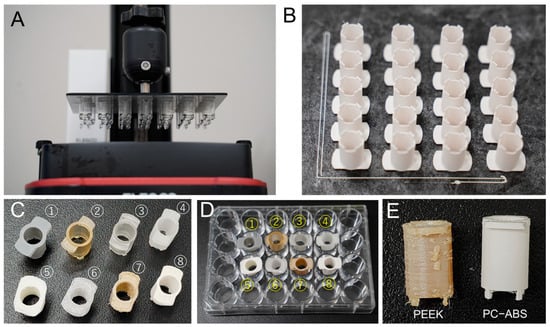 Photographs of the 3D-printed components of XL-inserts. The STL design file can be found in Supplemental File S1. (A) Components of XL-insert printed using an LCD 3D printer with zSG resin, shown still attached to the build plate. (B) XL-insert components printed using an FDM 3D printer with PC-ABS filament, with dimensions of 11 mm (X-axis), 18 mm (Y-axis), and 18 mm (Z-axis). (C) Components of XL-insert fabricated with various materials: ① ABS-like resin, ② SG resin, ③ zSG resin, ④ Nylon680 filament, ⑤ PLA filament, ⑥ PC filament, ⑦ PEEK filament, and ⑧ PC-ABS filament. (D) Components of XL-insert placed in a 24-well plate for scale and reference. (E) Comparison of XL-insert components made from PEEK and PC-ABS materials.