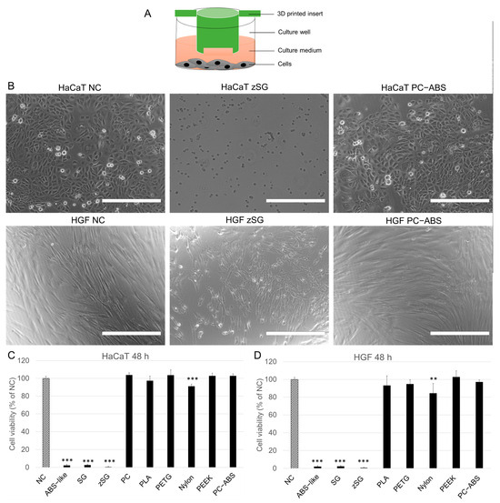 Cytotoxicity to HaCaT keratinocytes and hGFs of 3D-printed XL-insert components fabricated from different materials. HaCaT cells (3 × 104 cells/well) or hGFs (1 × 104 cells/well) were seeded in 24-well plates and cultivated for 24 h. The 3D-printed XL-insert components were then placed in the culture wells above the cells, and cultivation continued for an additional 48 h. At the end of the cultivation period, cell viability was measured using PrestoBlue assays. (A) Schematic illustration of the culture model. (B) Representative images of HaCaT cells and hGFs cultured with 3D-printed inserts fabricated from zSG resin and PC-ABS filament for 48 h. NC, negative control. Scale bars = 150 μm (C) Cell viability of HaCaT cells. (D) Cell viability of hGFs. ** p < 0.01, *** p < 0.001 vs. NC. Experiments were repeated five times independently.
