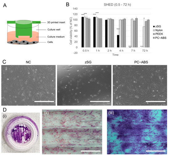 Cytotoxicity to SHED cells of 3D-printed XL-insert components fabricated from different materials. SHED cells (1 × 104 cells/well) were seeded in 24-well plates and cultivated for 24 h. The 3D-printed XL-insert components were then placed in the culture wells above the cells, and cultivation continued for 0.5 to 72 h. At the end of the cultivation period, cell viability was measured using PrestoBlue assays. (A) Schematic illustration of the culture model. (B) Cell viability of SHED cells. NC, negative control. * p < 0.05, *** p < 0.001 vs. NC. (C) Representative images of SHED cells cultured with 3D-printed XL-insert components fabricated from zSG resin and PC-ABS filament for 4 h. Scale bars = 150 μm. (D) SHED cells (0.5 × 104 cells) were seeded in a 3D-printed culture dish (outer diameter = 1 cm) and cultured for 24 to 72 h, followed by Giemsa staining. (i) Digital photograph showing SHED cells grown on the 3D-printed PC-ABS culture dish (the STL design file can be found in the Supplemental File S2). (ii,iii) Microscopic images of SHED cells grown on the surface of the PC-ABS culture dish for 24 h (ii) and 72 h (iii). Scale bars = 150 μm.