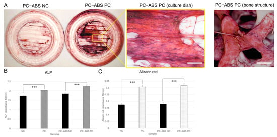 We further evaluated the effects of PC-ABS sculptures on osteogenic differentiation of SHED cells. As shown in Figure 4A, after 3 weeks of cultivation in the osteogenic medium, SHED cells on PC-ABS culture dishes and micro bone structures (PC-ABS PC) exhibited strong ALP activity compared to the negative control (PC-ABS NC). Quantitative analysis of ALP and Alizarin red staining revealed that SHED cells on PC-ABS sculptures demonstrated significantly higher ALP activity and mineralization capacity, comparable to cells cultured on commercially available 24-well plates (Figure 4B,C).