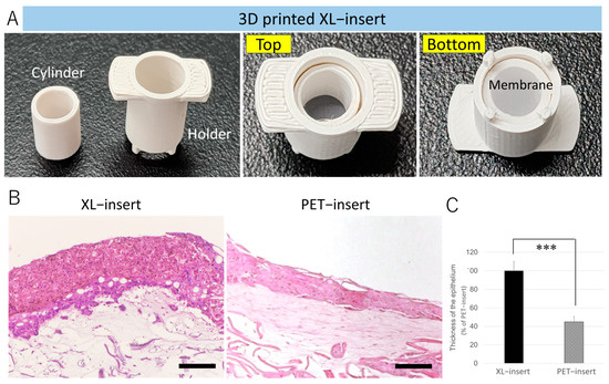 Next, we assessed the suitability of PC-ABS XL-inserts for gingival tissue formation. Using Blender 3.6 software, we designed the XL-insert components, including a cylinder and holder to secure the membrane in place (Figure 5A; Supplemental Files S1 and S4). As shown in Figure 5B, gingival tissue equivalents constructed in the PC-ABS XL-insert displayed a thicker epithelium compared to those in the PET-insert. Quantitative analysis indicated that the epithelial thickness in the PC-ABS XL-insert was 2.2 times greater than in the PET-insert (p < 0.001).