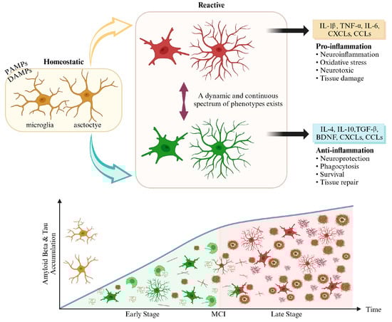 Microglial and astrocytic polarization during neurodegenerative disease progression. Resting microglia respond to PAMPs and DAMPs by polarizing them into proinflammatory or anti-inflammatory microglia. Proinflammatory microglia are associated with the secretion of IL-1β, TNF-α, IL-6, CXCLs, and CCLs, leading to neuroinflammation, oxidative stress, neurotoxicity, and tissue damage. In contrast, anti-inflammatory microglia release IL-4, IL-10, TGF-β, CXCLs, CCLs, and BDNF, promoting neuroprotection, phagocytosis, survival, and tissue repair. Similarly, astrocytes polarize into different reactive states, which can be broadly categorized as neurotoxic or neuroprotective, depending on the specific pathological context. The early activation of microglia is associated with the accumulation of Aβ and tau proteins. Studies evaluating the temporal changes in microglial activation in patients with mild cognitive impairment (MCI) and AD suggest that microglia play a primarily neuroprotective role in the early stages of AD. However, as the transition from the MCI stage to the dementia stage progresses, microglia shift toward a proinflammatory state.