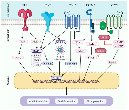 Microglia utilize various receptors, such as Toll-like receptors (TLRs), NOD-like receptors (NLRs), RAGE, purinergic receptors, and others, to detect these signals []. After detecting inflammatory signals, microglia secrete proinflammatory cytokines (e.g., IL-1β, TNF-α, and IL-6) and anti-inflammatory cytokines (e.g., IL-4, IL-10, and TGF-β) to regulate the inflammatory response. Microglia also modulate inflammation in the nervous system through processes such as phagocytosis to eliminate damaged cells or pathogens and the secretion of chemokines to recruit immune cells to the inflammation site [,]. The ability of microglia to detect and regulate these signals is essential for maintaining the health of the nervous system and inducing appropriate immune responses in the context of damage or disease.