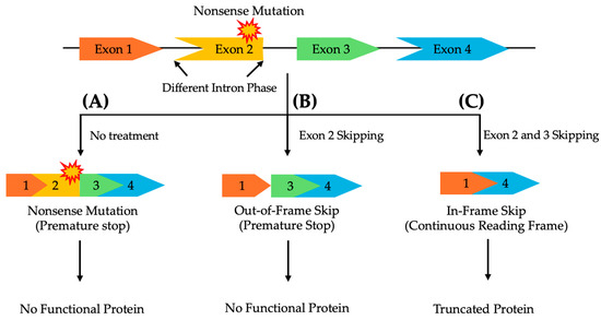 A schematic representation of multi-exon skipping to exclude pathogenic variants in asymmetrical exons, flanked by differing intron phases, while preserving the reading frame to enable the production of a functional protein. (A) Without treatment, a nonsense mutation in exon 2 prevents the synthesis of a functional protein. (B) Skipping only exon 2 disrupts the reading frame, leading to a non-functional protein. (C) Skipping both exons 2 and 3 restores the reading frame, resulting in a truncated, yet functional, protein.