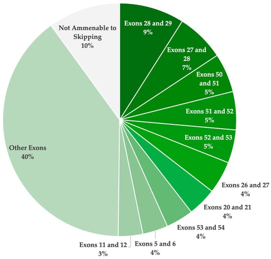 Although numerous strategies were identified to be theoretically applicable for the dysferlinopathy patient population, as reported in the UMD-DYSF database, none of these therapies have yet to receive FDA approval. In total, 61 strategies (39 single- and 22 double-exon skipping) were identified to be applicable. Figure 3 illustrates the total theoretical applicability of single- and double-exon skipping for the treatment of dysferlinopathies, highlighting the top ten exon skipping targets. A total of 44.6% of the reported pathogenic variants were determined to be amenable through single-exon skipping. Furthermore, 90.0% of the patient population was determined to have a pathogenic variant with the potential to be excluded through either single- or double-exon skipping. These findings confirm the incredible potential of ASO-mediated exon skipping to treat most patients with pathogenic DYSF variants resulting in disease.