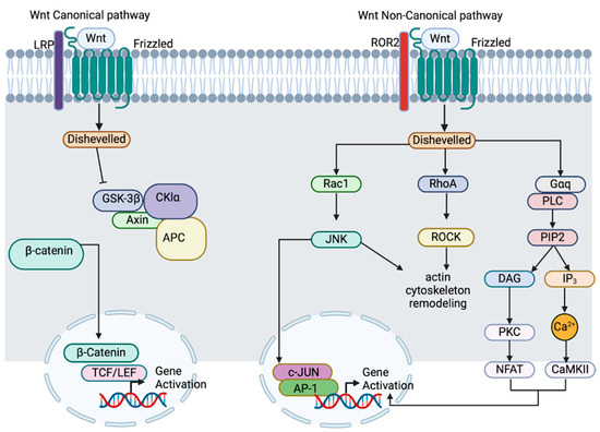 Canonical Wnt pathway (left): Wnt ligands (such as Wnt1, Wnt2, Wnt3, Wnt3a, and Wnt 8) bind to the frizzled (FZD) receptor and its coreceptors LRP5/6 (LDL-receptor-related proteins). This interaction recruits disheveled (DVL) and disrupts the destruction complex (AXIN, GSK-3β, CKIα, and APC), which normally degrades β-catenin. As a result, β-catenin accumulates in the cytoplasm, translocates to the nucleus, and binds to TCF/LEF transcription factors, leading to gene activation. The target genes of this pathway include important regulators of cellular differentiation and proliferation, such as c-Myc and cyclin D. Non-canonical pathway (right): The non-canonical Wnt pathways (such as the Wnt/PCP and Wnt/Ca2+ pathways) are β-catenin-independent and involve different ligands (e.g., Wnt5a, Wnt4, and Wnt11). These ligands bind to FZD and other co-receptors such as ROR2. The signaling cascade activates proteins such as Rac1, RhoA, JNK, ROCK, and Ca2+-dependent effectors like CAMKII and NFAT. These pathways control processes like cytoskeletal remodeling, cellular migration, and polarization. Figure created on https://BioRender.com accessed on 16 September 2024.