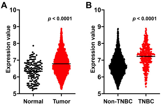 Using data from TCGA, we analyzed PTK7 mRNA expression in both tumor and adjacent normal tissues, as well as in non-TNBC and TNBC. The results show that PTK7 mRNA levels were significantly higher in BC tumor tissues compared with adjacent normal tissues. Furthermore, tumor tissues from TNBC exhibited significantly higher PTK7 mRNA expression than non-TNBC tumor tissues (Figure 1A,B).