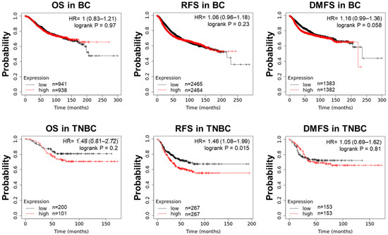 Survival analysis based on PTK7 mRNA expression in BC and TNBC cohorts. The prognostic significance of PTK7 mRNA expression in BC and TNBC was evaluated using the Kaplan–Meier Plot database (http://kmplot.com/analysis/ accessed on 6 January 2024). OS and RFS were analyzed in all BC patients, while DMFS was assessed in patients with lymph node-positive cancer. The number of patients with low and high PTK7 expression used in each analysis is indicated. Statistical significance was determined using log-rank tests. A hazard ratio (HR) below 1 indicates better survival probabilities for the low-PTK7-expression group compared with the high-PTK7-expression group.