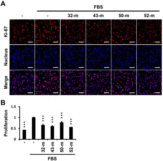Effect of anti-PTK7 mAbs on proliferation in MDA-MB-231 cells. MDA-MB-231 cells were incubated in DMEM without or with 5% FBS and treated with anti-PTK7 mAbs (32-m, 43-m, 50-m, and 52-m; 10 μg/mL) for 24 h. Proliferating cells were detected by staining with anti-Ki-67 and Rhodamine Red-X-conjugated anti-mouse IgG antibodies, with nuclear staining performed with Hoechst 33258. (A) Representative images were captured using confocal fluorescence microscopy at 200× magnification. (B) Quantification of Ki-67 staining was performed using ImageJ software (version 1.53), normalized to nuclear staining. Each value represents the mean ± SD of three independent experiments, with statistical significance denoted as *** p < 0.001 compared with the FBS-treated control group. The scale bar represents 100 μm.