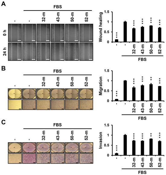To assess the impact of anti-PTK7 mAbs on oncogenic behaviors beyond proliferation, we conducted wound healing, migration, and invasion assays in MDA-MB-231 cells following treatment with PTK7 mAbs. In wound healing assays, the FBS-depleted group showed a reduction to 11.9 ± 0.6% compared with the FBS-treated control. Treatment with anti-PTK7 mAbs significantly decreased wound healing rates to 66.6 ± 3.3% for 32-m, 74.2 ± 3.5% for 43-m, 80.3 ± 1.3% for 50-m, and 70.2 ± 2.9% for 52-m (Figure 4A). In chemotactic migration assays, the FBS-depleted group was reduced to 8.1 ± 0.4% relative to the FBS-treated control, while anti-PTK7 mAbs reduced migration to 65.5 ± 5.1% for 32-m, 76.2 ± 3.8% for 43-m, 81.7 ± 5.2% for 50-m, and 72.0 ± 0.7% for 52-m (Figure 4B). In chemotactic invasion assays, the FBS-depleted group showed a reduction to 9.2 ± 1.6% compared with the FBS-treated control, with anti-PTK7 mAbs reducing invasion to 71.9 ± 3.6% for 32-m, 71.1 ± 1.8% for 43-m, 81.4 ± 1.4% for 50-m, and 69.5 ± 3.0% for 52-m (Figure 4C). These findings confirm the anti-tumor effects of anti-PTK7 mAbs on MDA-MB-231 cells at the cellular level, with relative efficacy ranked as 32-m, 52-m, 43-m, and 50-m.