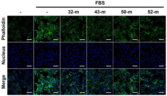 Actin polymerization, essential for migration and invasion, in MDA-MB-231 cells treated with or without PTK7 mAbs was evaluated using immunofluorescence staining with fluorescein isothiocyanate (FITC)-conjugated phalloidin. In the FBS-treated control group, strong actin filament polymerization was observed in the cortical regions, particularly at leading edges and focal contacts. In contrast, treatment with anti-PTK7 mAbs (32-m, 43-m, 50-m, and 52-m) significantly reduced actin polymerization to levels close to those in FBS-depleted conditions (Figure 5). These findings suggest that anti-PTK7 mAb treatment impairs the migratory and invasive capabilities of TNBC cells, at least in part, by effectively reducing actin polymerization.