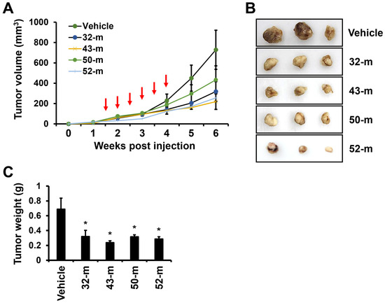 To evaluate the in vivo anti-cancer effects of anti-PTK7 mAbs on TNBC, we utilized the tumorigenic potential of MDA-MB-231 cells in a xenograft mouse model. Mice were subcutaneously injected with MDA-MB-231 cells to induce tumor formation, and anti-PTK7 mAbs (10 mg/kg) were administered intravenously twice a week for 3 weeks. Two weeks after the final treatment, the mice were euthanized, and the tumors were collected for analysis. Tumor volumes in the vehicle group were 728.7 mm3, while significant reductions were observed in the treatment groups: 43.7 ± 10.9% for 32-m, 30.0 ± 8.5% for 43-m, 59.4 ± 15.3% for 50-m, and 35.1 ± 25.9% for 52-m, compared with the vehicle control group (Figure 6A). Similarly, tumor weights in the vehicle control group averaged 0.69 g, with significant reductions observed in the treatment groups: 46.5 ± 12.0% with 32-m, 34.4 ± 3.6% with 43-m, 46.0 ± 3.6% with 50-m, and 41.6 ± 4.1% with 52-m, compared with the vehicle control group (Figure 6B). These results demonstrate that anti-PTK7 mAbs significantly reduce both tumor volume and weight in the TNBC xenograft mouse model, with relative efficacy ranked as 43-m, 52-m, 32-m, and 50-m. Among the treatment groups, 43-m and 52-m exhibited significantly lower tumor weights compared with 32-m and 50-m.