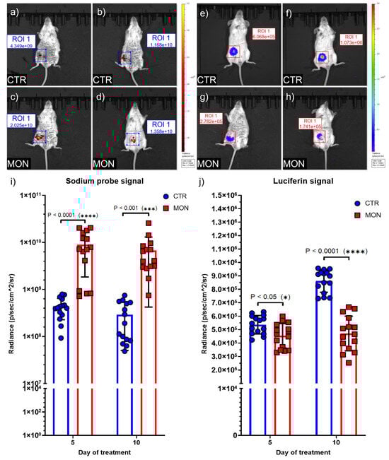 Bioluminescence imaging using the IVIS® Spectrum was employed to monitor the distribution of 4T1-Luc2-Luc2 tumor cells and the development of the tumor. The IVISbrite™ D-luciferin ultra bioluminescent substrate in RediJect™ solution (RediJect D-luciferin ultra K+ salt) was injected i.p. following the manufacturer’s guidelines (150 mg/kg). The bioluminescence signal, derived from living luciferase-expressing cells, directly represented the tumor mass, whereas a decrease in bioluminescence signals corresponded to necrotic areas. The fluorescent cytosolic Na+ indicator CoroNa™ Green-AM was used to assess the Na+ concentrations in tumor and healthy tissues. Just prior to imaging acquisition, mice were injected with a solution (100 μL) containing the intracellular Na+-fluorescent dye (67 μM) in 0.9% NaCl with BSA (4%) and pluronic acid (0.02%). Intracellular Na+ variations following monensin treatment were monitored using the IVIS® Spectrum in vivo imaging system set to excitation at 500 nm and emission at 540 nm.