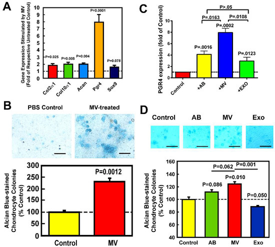 Osteoclastic MVs, ABs, and EXOs upregulated the expression of chondrogenic genes (A), especially Pgr4 (C), but only MVs and not ABs or EXOs significantly promoted the formation of acidic proteoglycan-producing colonies (B,D) in primary chondrocytes. Osteoclastic MVs, ABs, and EXOs were isolated from the same pooled CM of RAW-OC by sequential centrifugation and were redissolved in PBS. A: Articular chondrocytes were treated with 45 µg MV protein/mL of osteoclastic MVs (or PBS as control) for 24 h, and the expression levels of chondrogenic genes (i.e., Col2α1, Col10α1, Acan, Pgr4, and Sox9) were determined by RT-qPCR and normalized against β-actin (mean ± SEM, n = 3). Dashed line = 100% of controls. B: Chondrocytes cultured in DMEM/F-12 medium containing 2% FCS and 1% ITS were treated with PBS or osteoclastic MVs for 21 days. Top: acidic proteoglycan-producing colonies were stained with alcian blue. Scale bar = 1 mm. Bottom: the alcian blue stain was eluted with 8M guanidine HCl and absorbance read at 600 nm (mean ± SEM, n = 3). Dashed line = % of the PBS control. C: Chondrocytes were treated with osteoclastic MVs, ABs, or EXOs at a concentration of ~45 µg protein/mL, or PBS for 24 h. The expression level of Pgr4 mRNA in cells treated with each EV was determined by RT-qPCR normalized against β-actin mRNA. Results are reported as relative % of respective PBS-treated cells (mean ± SEM, n = 4). The p-values are determined by two-tailed Student’s t-tests. D: Chondrocytes were treated with MVs, ABs, EXOs, or PBS in DMEM/F-12 medium with 10% FCS for 21 days. Top: acidic proteoglycan-producing colonies were stained with alcian blue. Scale bar = 1 mm. Bottom: the eluted alcian blue stain. Results were shown as mean ± SEM (n = 3). Dashed line = % of the PBS control. The level of stimulation by MVs in panel D was smaller than that shown in panel B because 10% FCS instead of 2% FCS was used. The p-values are determined by two-tailed Student’s t-tests.