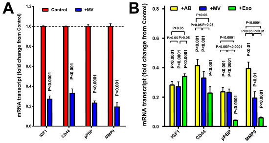 Osteoclastic MVs (A), as well as osteoclastic ABs and Exos (B) substantially downregulated the expression of pro-inflammatory genes in primary mouse synoviocytes. Primary mouse synoviocytes were treated with osteoclastic MVs or PBS in (A) or osteoclastic MVs, ABs, EXOs, or PBS (B) for 48 h. Total RNA was extracted from all treated cells, and the mRNA levels of several pro-inflammatory genes, i.e., IGF-1, CD44, pPBP, and MMP9 were determined by RT-qPCR and normalized against β-actin mRNA (mean ± SEM, n = 3). The p-values were determined by two-tailed Student’s t-tests compared to the respective control group. The dashed line is 100% of the respective controls.