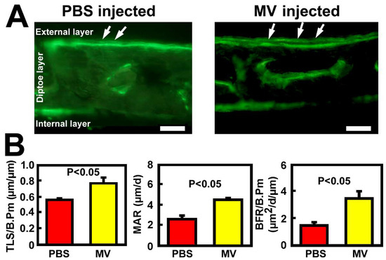 A calvarium injection assay [33] was then used to evaluate the in vivo bone-forming activity of osteoclastic MV. Accordingly, daily local injection of osteoclastic MVs at ~60 µg MV protein (in 20 µL PBS) for five consecutive days significantly increased dynamic formation parameters, i.e., TLS/B.Pm, MAR, BFR/B.Pm, at the external layer compared to PBS-injected control calvaria (Figure 4), confirming that osteoclastic MVs are a potent local osteoanabolic agent in vivo.
