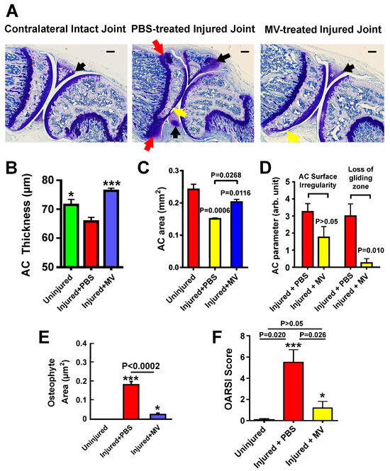 Toluidine blue staining of acidic cartilage on longitudinal sections of uninjured contralateral joints and injured joints treated with PBS or MV shows that the PBS-injected injured joint had less and thinner articular cartilage layer (yellow arrows), more osteophyte-like tissues (red arrows), and greater mineralized area in the meniscus (black arrows) than the uninjured contralateral joint. However, the MV treatment appeared to return the articular cartilage thickness similar to that of a contralateral uninjured joint. It also showed much less osteophyte-like tissues and reduced area of mineralized meniscus (Figure 5A). Quantitative measurements of the average surface and average articular cartilage thickness at the injured tibial plateau revealed that PBS-injected injured knee joints lost significant articular cartilage surface area (Figure 5B) and reduced average thickness (Figure 5C) compared to the contralateral uninjured tibial plateau, confirming the development of OA at five weeks after the tibial plateau injury. In contrast, the MV-treated injured joints had greater articular cartilage area and thicker cartilage layer than PBS-injected OA joints, which were not statistically different from those of uninjured joints, suggesting that the treatment might have halted or even reversed the progression of OA development.