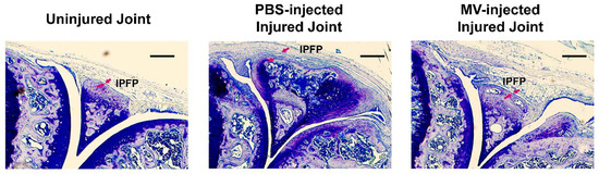 Biweekly intraarticular injections of osteoclastic MVs reduced synovial hyperplasia after intraarticular tibial plateau injury. Thin sagittal sections of joint sections of knee joints were stained with toluidine blue. The red arrows indicate the thickness of the synovium. This figure shows that the intraarticular tibial plateau injury after five weeks substantially increased the thickness of the synovium at the injured joint, and the osteoclastic MV biweekly injections prevented or reduced the synovial hyperplasia. IPFP = infrapatellar fat pad. Scale bar = 100 µm.