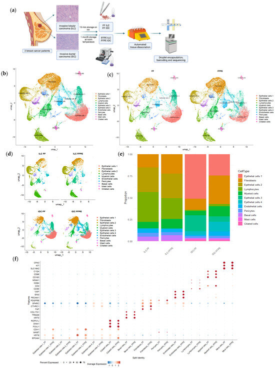 However, despite observing the same cell types in matched samples, we noted variations in proportions of the type of cells, mainly within IDC samples. In FFPE IDC, fibroblasts predominated; while in FF IDC, epithelial cells 1 and 4 were more prevalent. There were also some variations in ILC, albeit smaller. For example, FF ILC showed a higher percentage of lymphocytes than FFPE ILC, although they were abundant in both sample types (Figure 1e and Table S3). These results suggested the potential effect of tissue dissociation on cell type quantity.