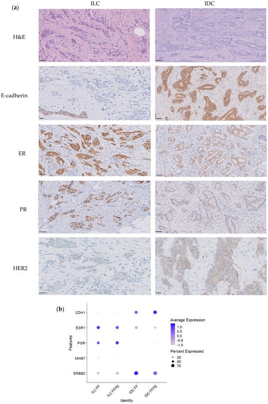 Hematoxylin and eosin staining, and marker expression evaluation used in routine diagnosis. (a) H&E, E-cadherin, ER, PR, and HER2 in ILC and IDC tumors (scale bar 50 μm). (b) Dot plot showing the expression of CDH1, ESR1, PGR, MKI67, and ERBB2 obtained through scRNAseq.