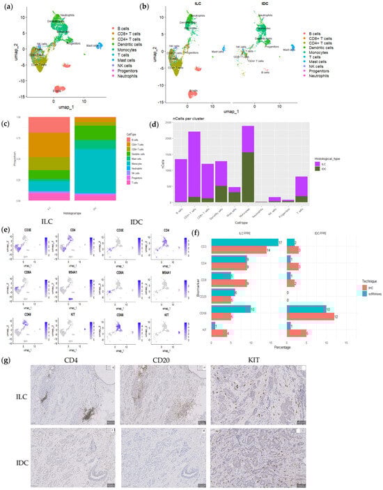 Immune cell scRNAseq and immunohistochemistry analysis. (a) UMAP plot automatically annotated by immune cell type using the Monaco reference dataset from singleR. (b) UMAP plot split by histological type. (c) Bar plot showing immune cellular proportions in each histological type. (d) Bar plot showing the number of each type of immune cells, colored by histological type. (e) Feature plot displaying specific markers of immune cells per histological type. (f) Graph showing the percentages of each immune population per sample by scRNAseq and digital analysis relative to the total number of cells in the sample. (g) Immunohistochemistry of FFPE ILC and FFPE IDC showing CD4, CD20 and KIT expression in immune cells (scale bar 50 μm).