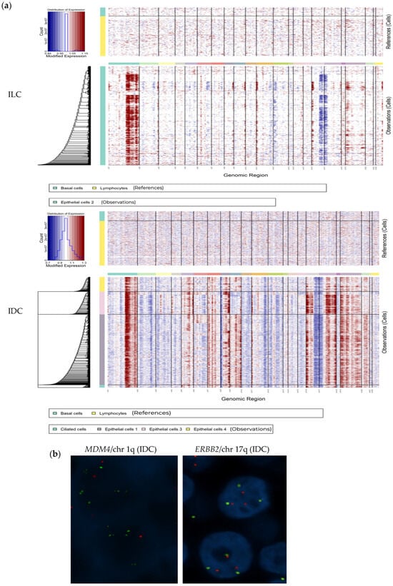 A total of 20,039 individual epithelial cells from four samples were analyzed (5058 cells from ILC and 14,981 cells from IDC) (Table S3). We identified normal basal cells by the expression of specific markers, such as KRT5, TRIM29 and COL17A1. This population of cells was present due to normal ducts entrapped in the neoplastic proliferation in both tumors. To confirm that the remaining epithelial cell clusters were neoplastic, we inferred CNVs in these cells using non-malignant cells (immune and basal cells) as a baseline. Figure 4a shows scRNAseq expression of epithelial cells with hallmark chromosome (chr) 1q gain and deletions of 16q and 17p in all populations. Chromosome 17q gain was observed only in the IDC epithelial cell populations. To validate these findings, we analyzed CNVs of MDM4/chr 1q and ERBB2/chr 17q by FISH (Figure 4b). Therefore, the FISH results validated the utility of scRNAseq data from FFPE samples for inferring tumor CNVs.