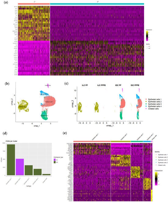 The analyzed ILC was composed of a single cluster of epithelial cells with a homogeneous expression profile (epithelial cells 2). In contrast, the IDC exhibited greater heterogeneity, comprising four distinct subtypes (epithelial cells 1, 3, 4 and MCCs) (Figure 5b–d).