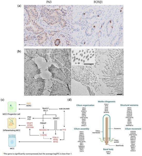 Multi-ciliated cells in the IDC case. (a) Immunohistochemistry of FFPE IDC showing P63 and FOXJ1 expression (scale bar 20 μm). (b) Scanning electron microscopy image showing the dense and organized structure of cilia on the surface of MCC (scale bar 500 nm). (c) Regulation of MCC cell fate determination, highlighting the genes overexpressed in the MCC population from our study (figure adapted from Lyu et al. []) (created in BioRender.com). (d) Genes involved in the regulation, formation, and function of cilia according GO-enriched biological processes indicated in Figure S4 (created in BioRender.com).